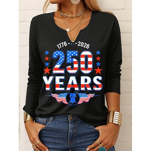 T-shirt grafica per il 250° Giorno dell'Indipendenza delle Donne Americane bandiera vintage stilosa moderna maniche lunghe collo intagliato top regolari stampa quotidiana da weekend blu nero khaki