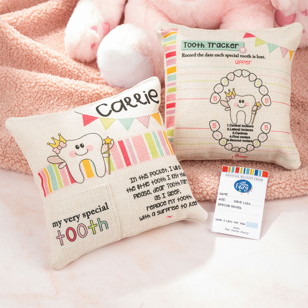 Cuscino personalizzato con nome e tasca per il primo dente perso, regalo di compleanno per bambini e bambine.