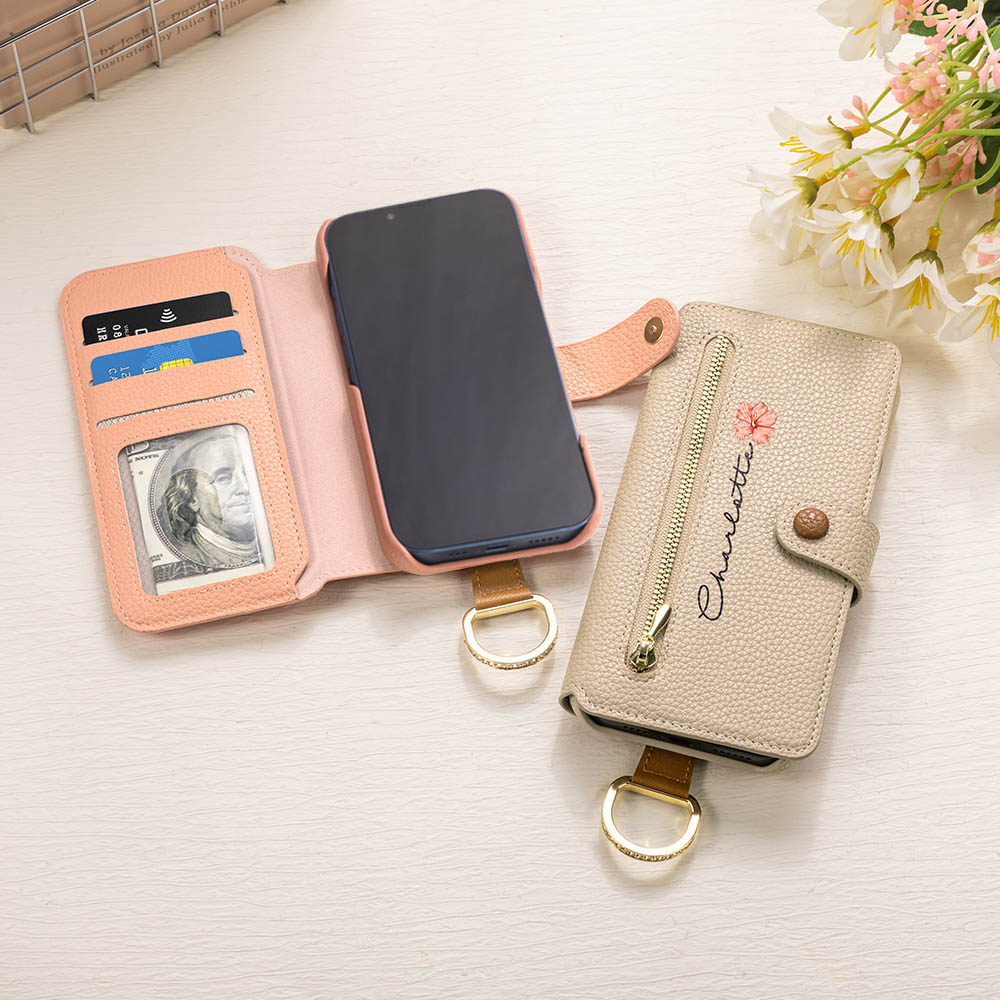 Anello di nascita personalizzato con design a fiori Custodia in pelle per telefono a flip con nome e portacarte con blocco RFID Regalo di compleanno per la festa della mamma per le donne