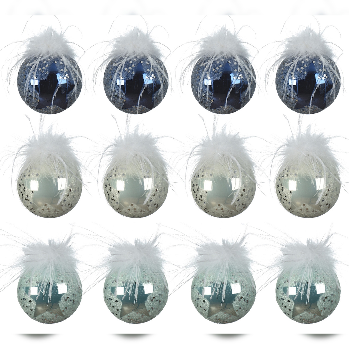 12 Weihnachtskugeln 8cm Glas Sterne Federn Christbaumkugeln mix blau silber