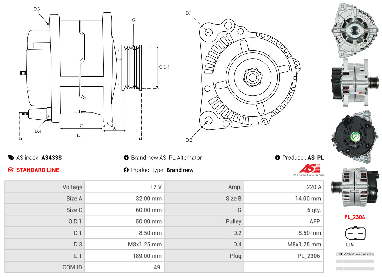 AS-PL Generator A3433S 12V 220A für MERCEDES-BENZ A0009062200 0009062200