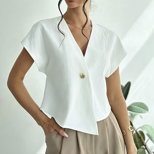 Per donna Camicia casual Camicia con Bottoni Blusa Bottoni Orlo asimmetrico Tinta unica Quotidiano Elegante Casual Manica Corta Scollo a V Top Regolari Quotidiano Ferie Abbigliamento mare Nero Bianco