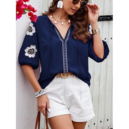 Per donna Camicia popover Camicia Estiva Camicia casual Blusa Ricamato Floreale Vacanza Elegante Casual Mezza Manica Scollo a V Top Regolari Quotidiano Spiaggia Ferie Blu Rosa Blu marino Albicocca