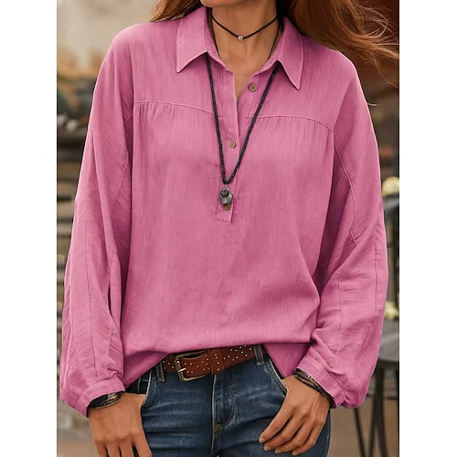 Per donna Camicia Camicie di cotone e lino Abbottonare Blusa Bottoni Tinta unica Elegante Casual Manica Lunga Colletto a Camicia Top Regolari Quotidiano Bianco Rosa Estate Primavera
