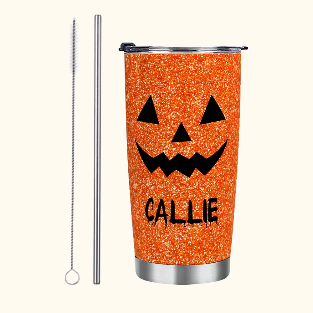 Bicchiere da 20 once con nome per famiglia e bambini personalizzato con motivo di zucca finto glitterato e divertente per il tema di Halloween