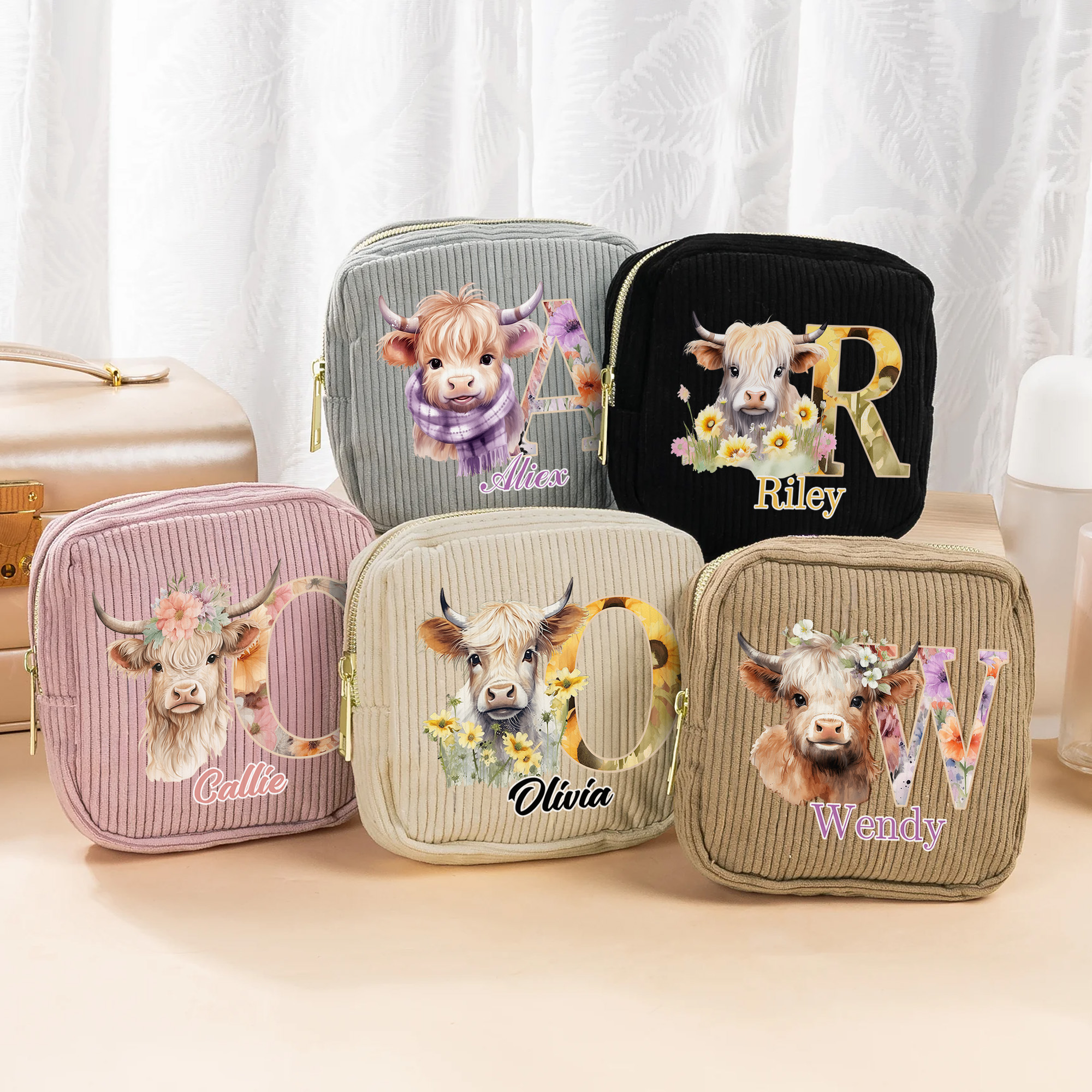 Personalizzato floreale iniziale Highland mucca quadrato velluto a coste borsa per il trucco con nome e cerniera viaggio regalo di compleanno per le donne amici