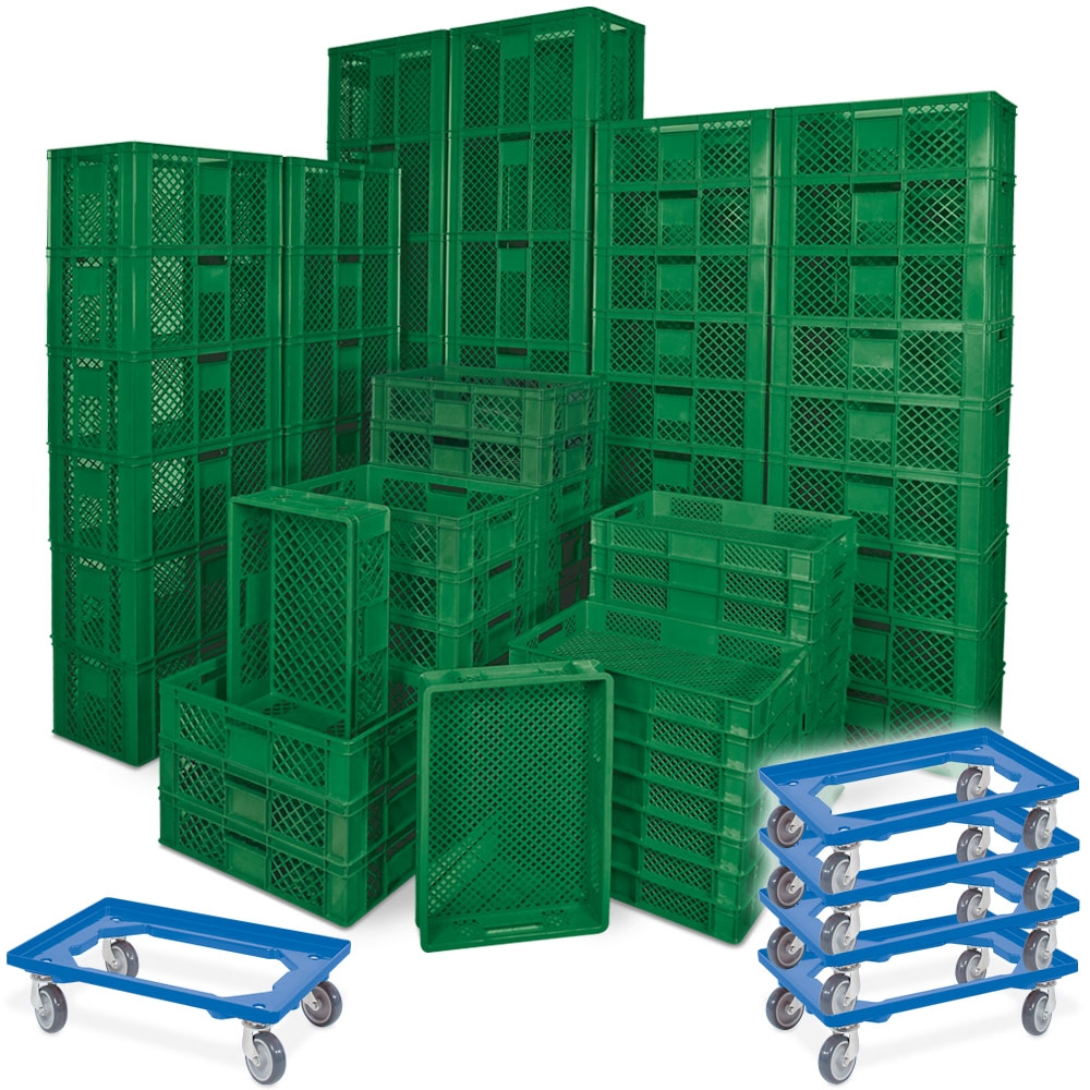 BRB 78 Stück Stapelkörbe/Bäckerkästen in 5 Größen, Grundmaß LxB 600 x 400 mm, H 90 mm, 150 mm, 240 mm, 320 mm, 410 mm, Farbe grün, blau