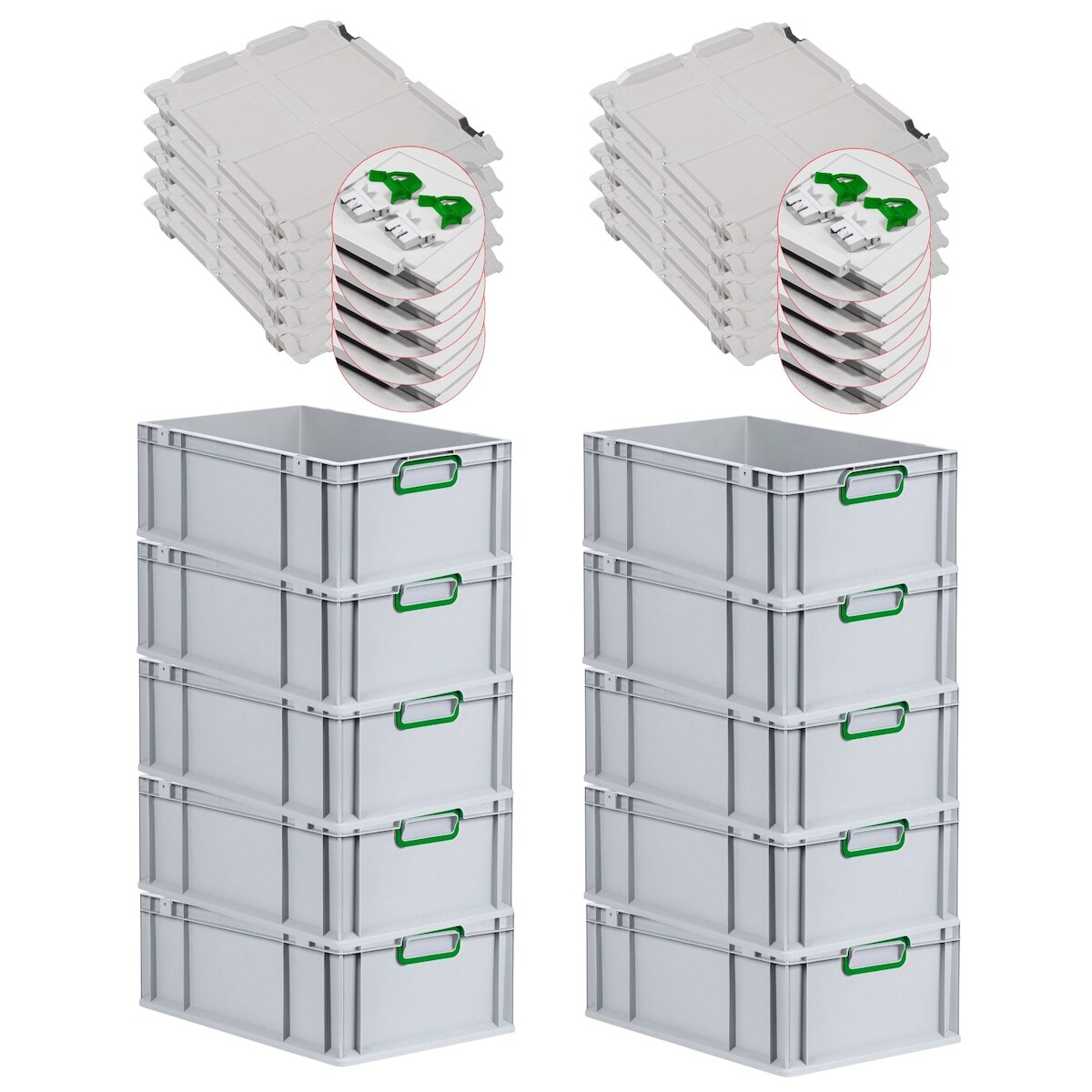 PROREGAL 10x Eurobox NextGen Color mit Scharnierdeckel & Verschlüssen | HxBxT 22x40x60cm | 44 Liter | Griffe grün geschlossen | Verstärkter Boden