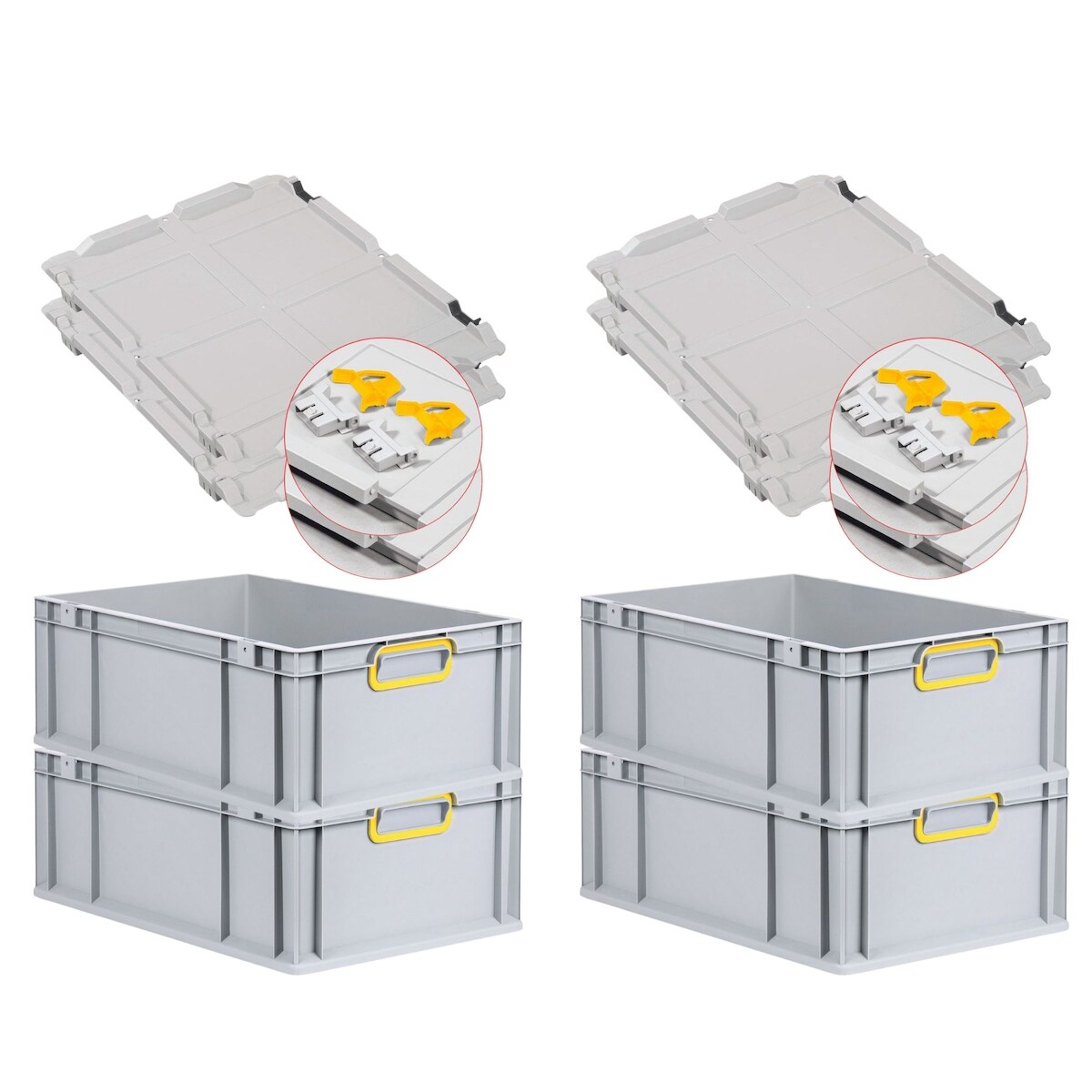 PROREGAL 4x Eurobox NextGen Grip mit Scharnierdeckel & gelben Verschlüssen | HxBxT 22x40x60cm | 44 Liter | Griffe offen | Verstärkter Boden