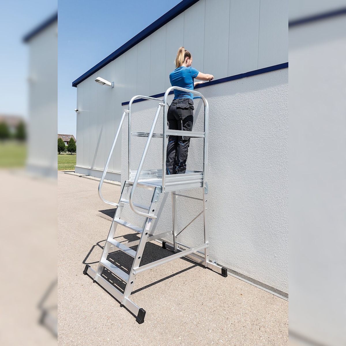 Munk Günzburger Steigtechnik MUNK Podestleiter mit Rollen und Griff Aluminium geriffelt 8 Stufen