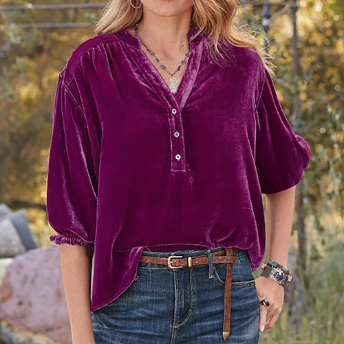 Per donna Velluto Elegant Elegante Blusa Tinta unica Semplice Elegante Vintage Quotidiano Mezza Manica Scollo a V Top Regolari Quotidiano Ferie Uscire Bottoni Nero Blu Viola Primavera Autunno