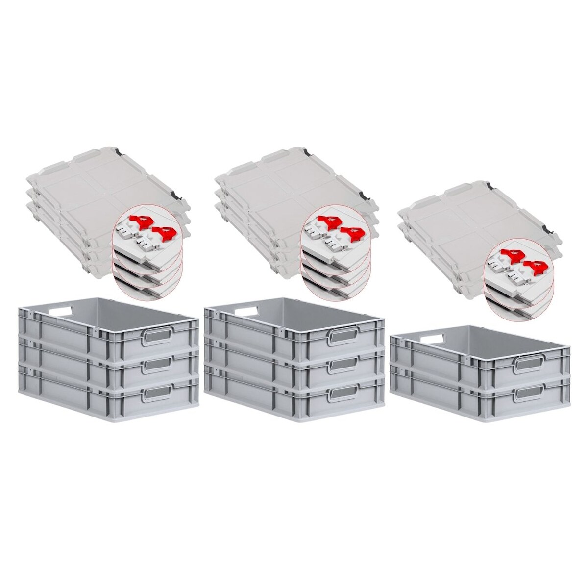 PROREGAL 8x Eurobox NextGen Grip mit Scharnierdeckel & roten Verschlüssen | HxBxT 12x40x60cm | 23 Liter | Griffe offen | Glatter Boden