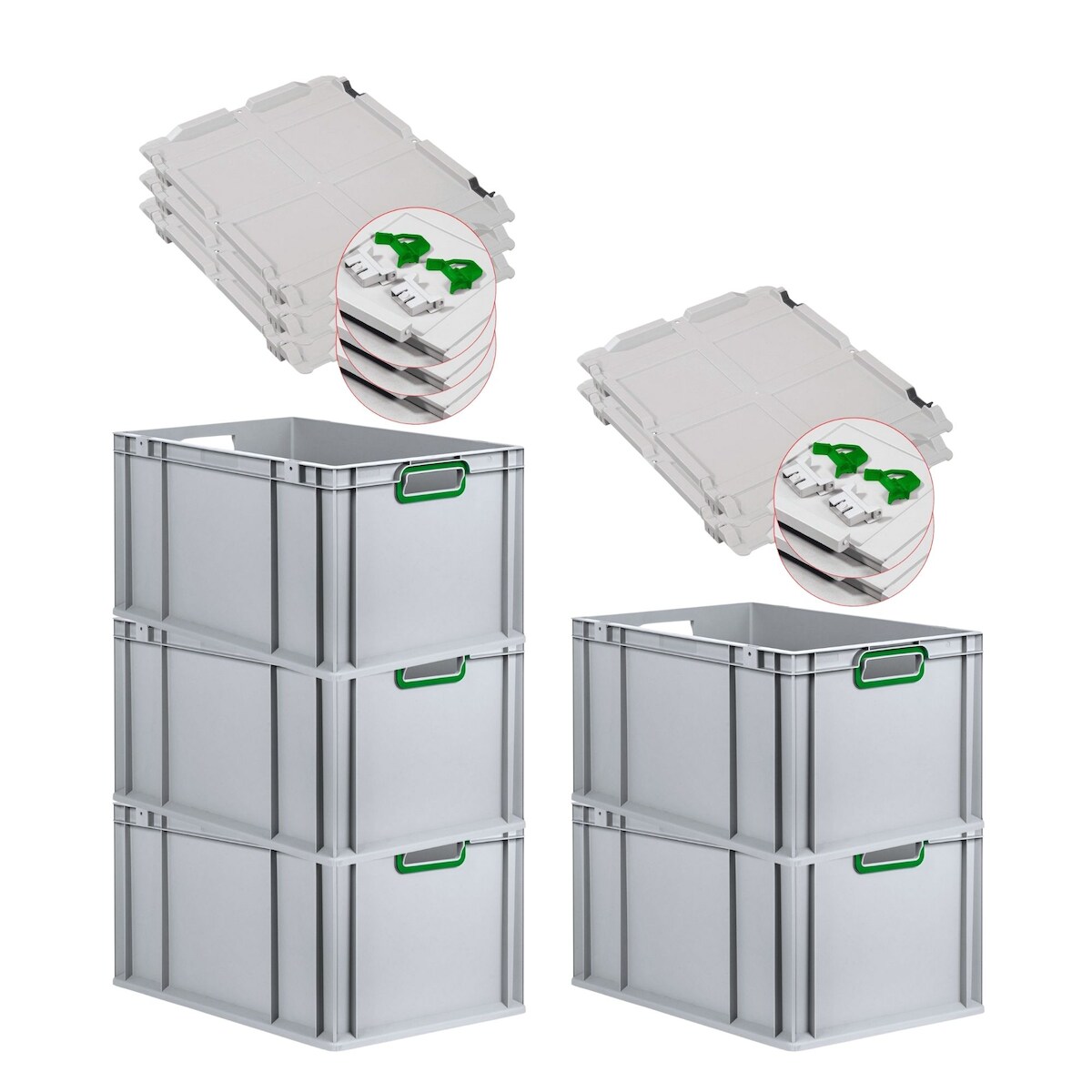 PROREGAL 5x Eurobox NextGen Color mit Scharnierdeckel & Verschlüssen | HxBxT 22x40x60cm | 65 Liter | Griffe grün offen | Verstärkter Boden
