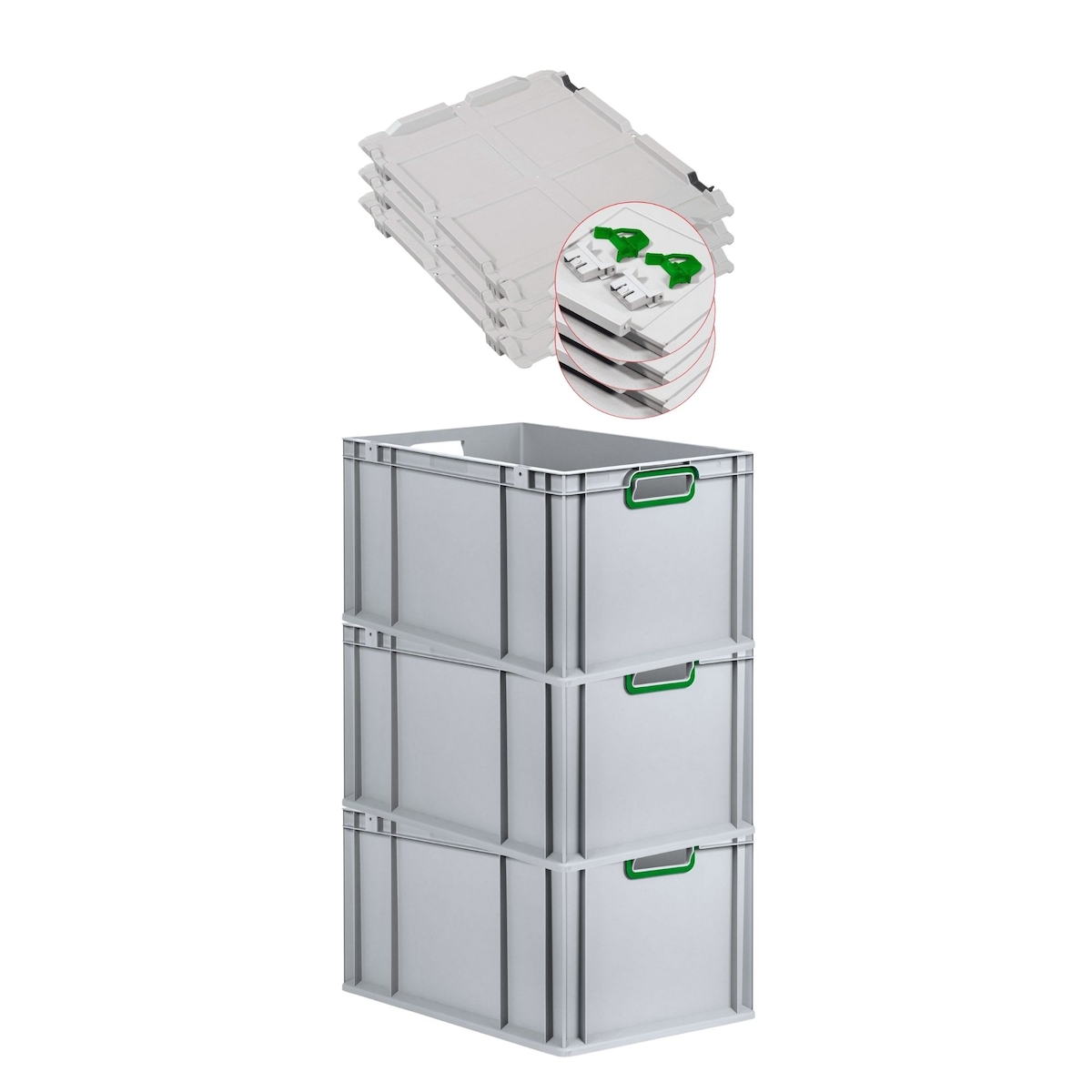 PROREGAL 3x Eurobox NextGen Color mit Scharnierdeckel & Verschlüssen | HxBxT 22x40x60cm | 65 Liter | Griffe grün offen | Verstärkter Boden