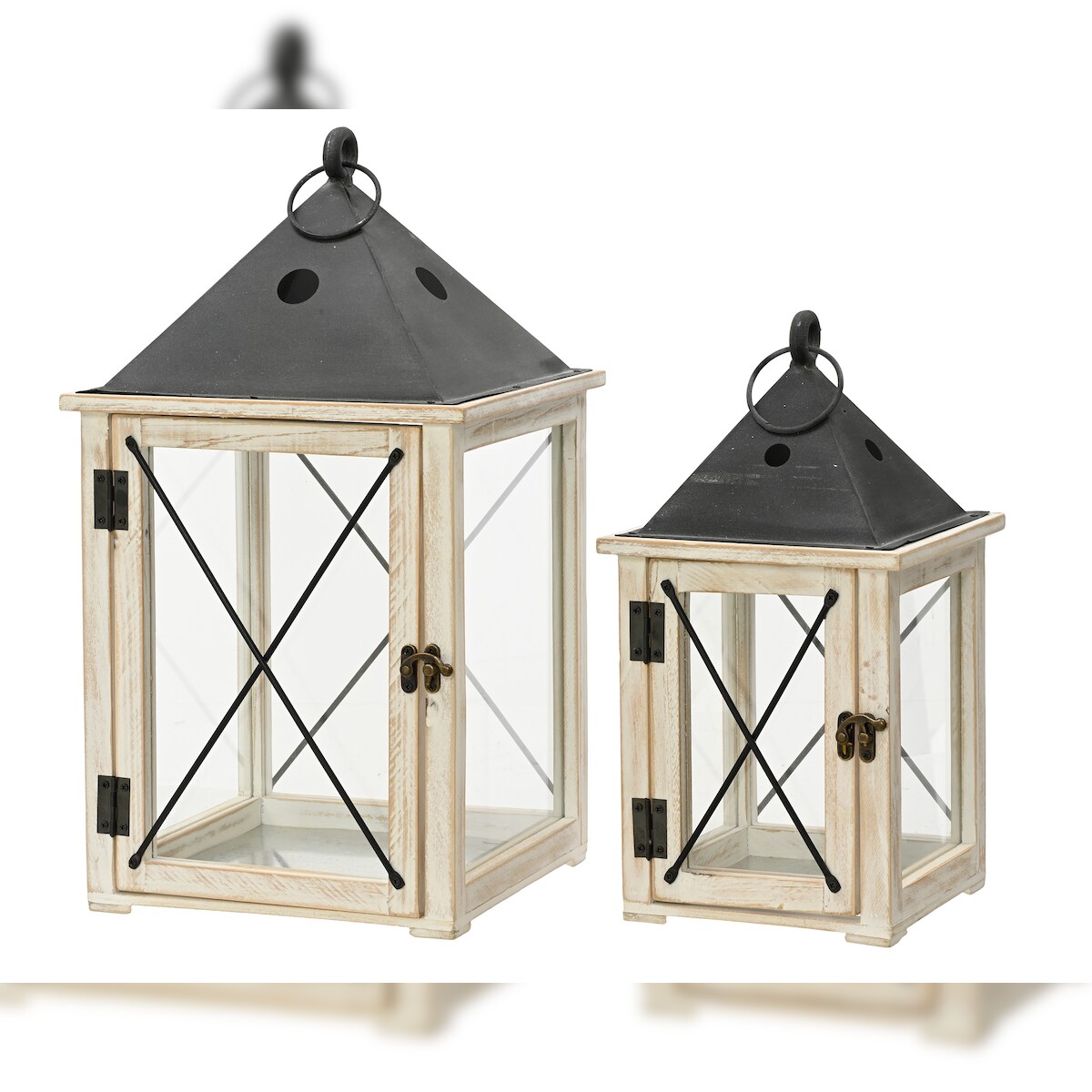 Laternen Holz FSC 100% Metall 24x46cm / 18x34,5cm mit Henkel 2er Set Windlicht Laterne Aufhängen Hinstellen Innen Außen Deko Holzlaterne Kerzenhalter