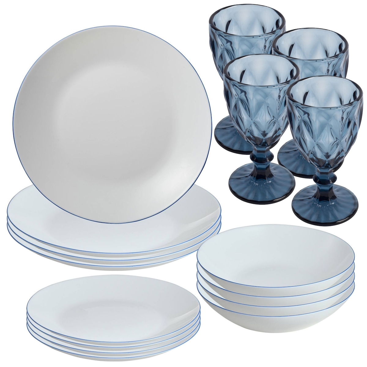 San Ignacio - 12-teiliges weißes Porzellan-Geschirrset mit blauem Rand mit Set aus 4 Gläser 260 ml Blau