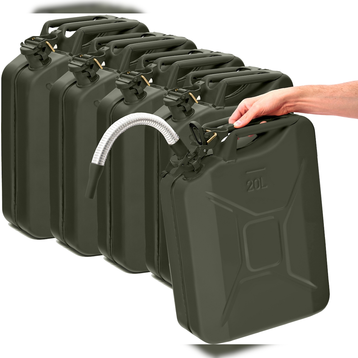 BW® Kraftstoffkanister Metall Benzinkanister 5x 20 Liter mit Ausgießer - Bronzegrün - RAL 6031-F9 - TÜV-geprüft und UN-Zulassung - Made in Europe