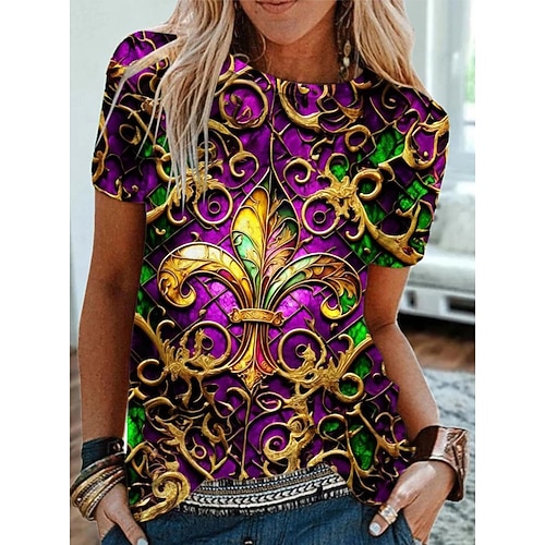 Carnevale Per donna Maglietta Floreale Vintage Elegante Classico Manica Corta Girocollo Top Regolari Quotidiano Stampato Viola Fucsia Estate Primavera