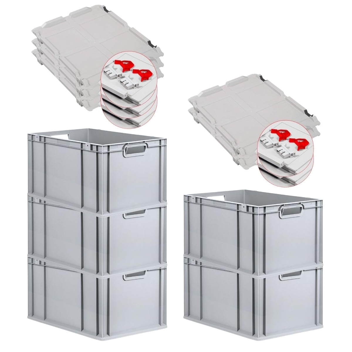 PROREGAL SuperSparSet 5x Eurobox NextGen Economy mit Scharnierdeckel & roten Verschlüssen, Griffe offen, HxBxT 32x40x60cm, 65L, Eurobehälter, Box
