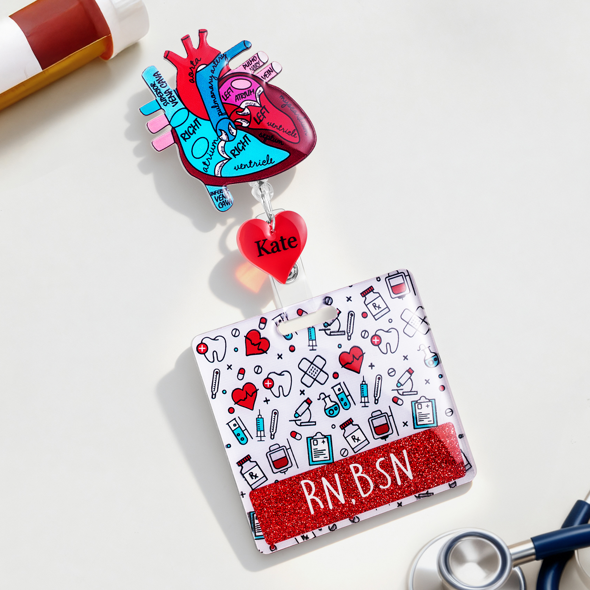 Avvolgitore per badge retrattile con nome e distintivo personalizzato con cuore anatomico glitterato Regalo di compleanno di apprezzamento per il personale medico infermieristico