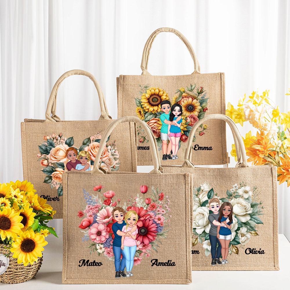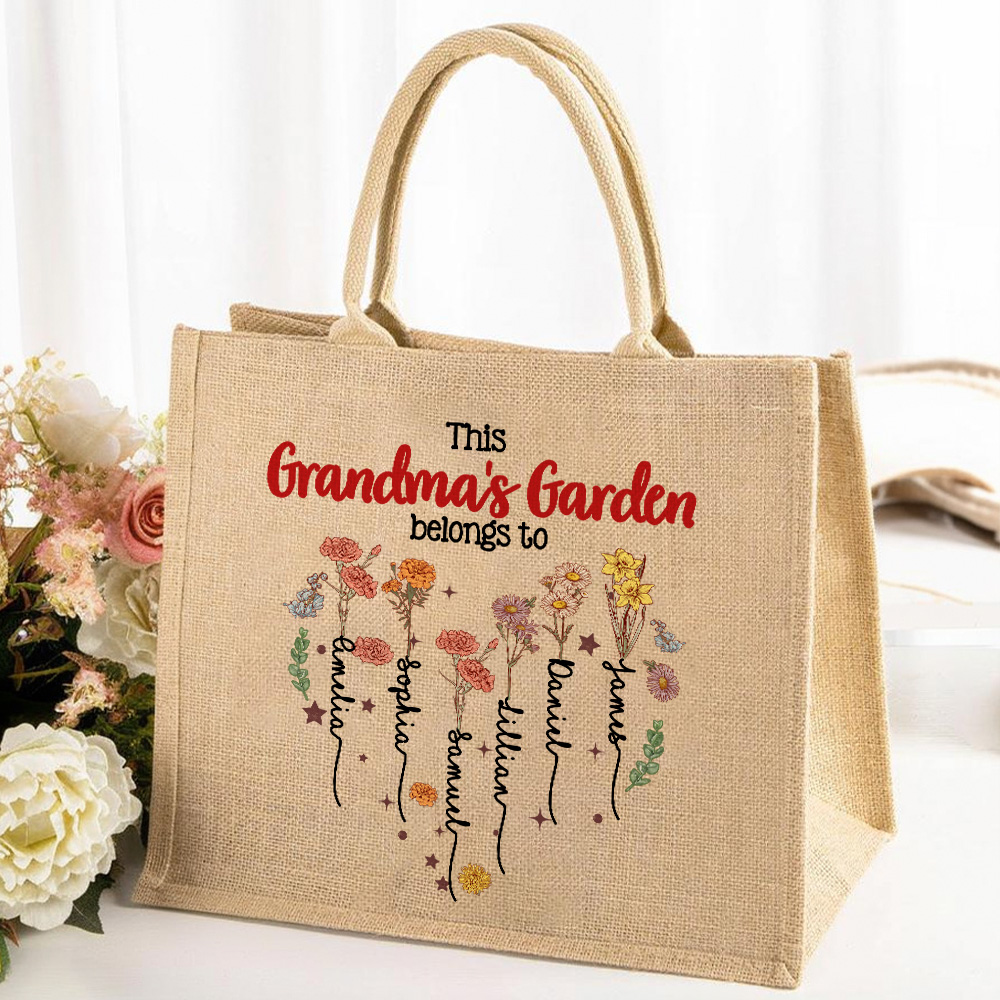 Sac en Toile de Jute Personnalisé avec 1-16 Nom et Fleurs de Naissance Cadeau Anniversaire Fête Voyage pour Maman Grand-Mère