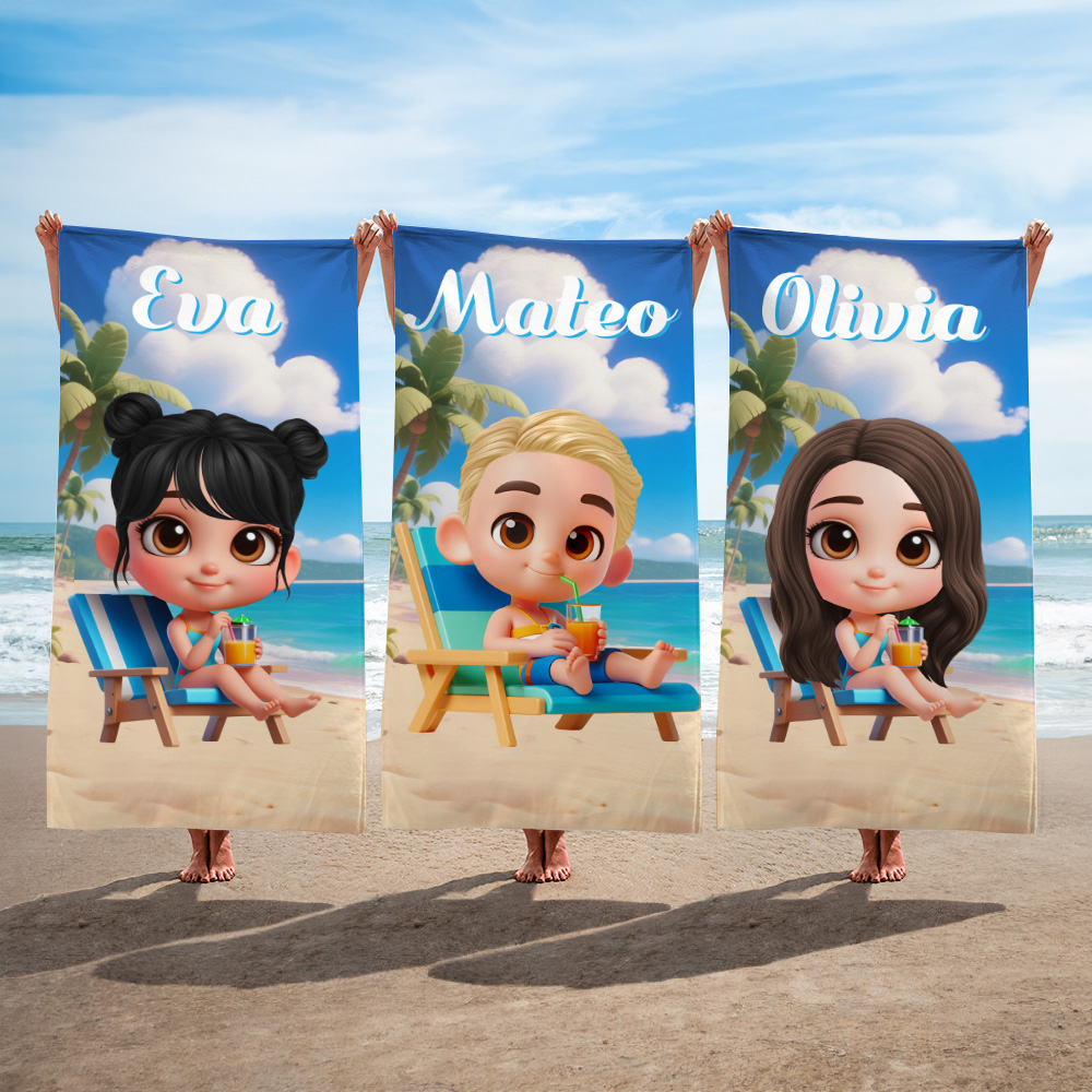 Toalla de playa personalizada con nombre 3D de dibujos animados de secado rápido regalo de cumpleaños para fiesta en la playa o viajes para niños