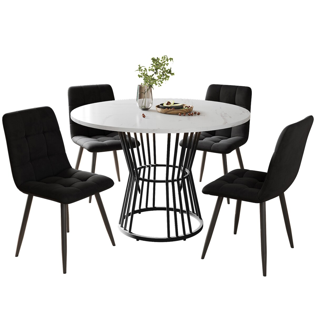 MODFU Essgruppe 5-teilig runder Esstisch Set mit 4 Samtstühlen 100x100x75 cm MDF Tischplatte in Marmoroptik Metallgestell Multicolor