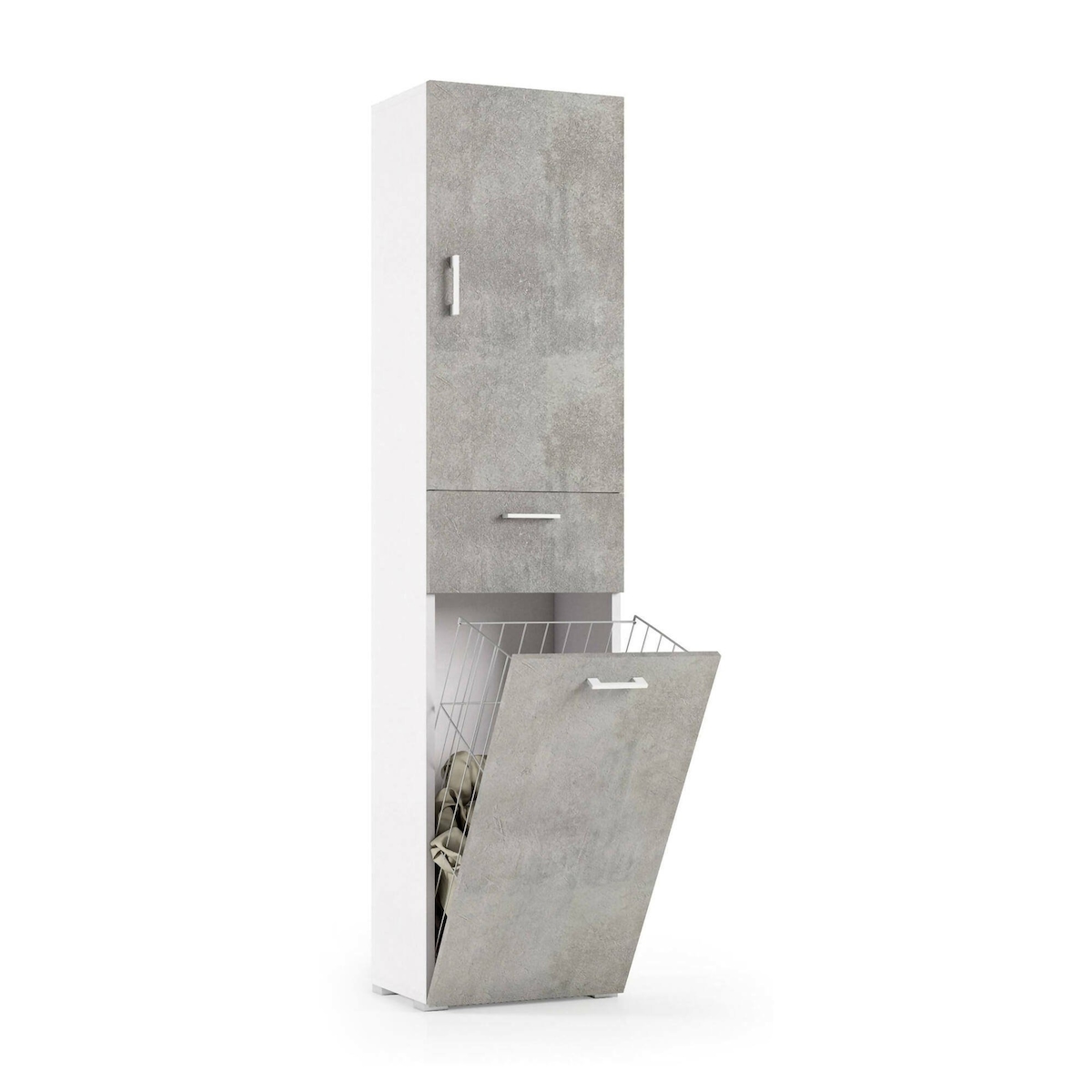 Dmora Mehrzweckschrank Escolzia, Linearer Wäscheschrank mit 2 Türen, Badezimmersäule mit Wäschekorb, 100% Made in Italy, 45x32h195 cm, Beton und Weiß