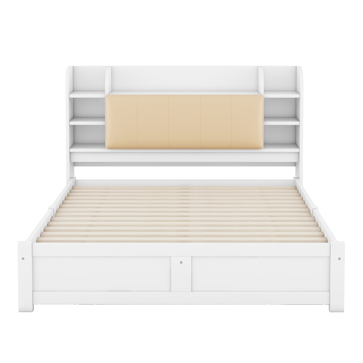 Merax 160*200cm Doppelbett, Flachbett, teilweise aufklappbares Kopfteil, vier Schubladen, mehrere Staufächer, weiß