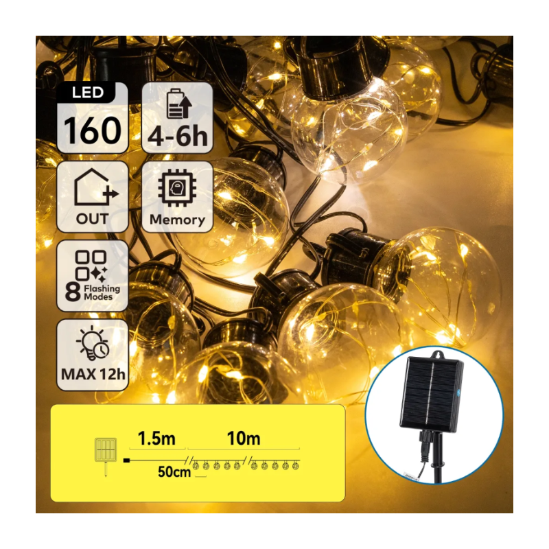 Aigostar Lichterkette/Solar/G50 Kupferdrahtlichter/1.5M+10M/160LED/50CM Abstand/8 Funktionen/IP65