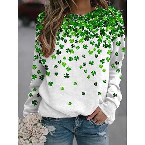 Felpe da donna per il Giorno di San Patrizio con grafica trifoglio casual a maniche lunghe colletto rotondo tops regolari casual stampa vacanza verde erba bianco verde primavera inverno