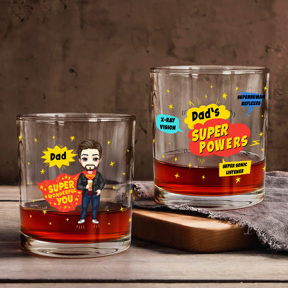 Personalizado Cool Super Power Dad Cartoon 10 oz Old Fashioned Whiskey Rocks Glass con nombre Cumpleaños Día del Padre de regalo para los hombres