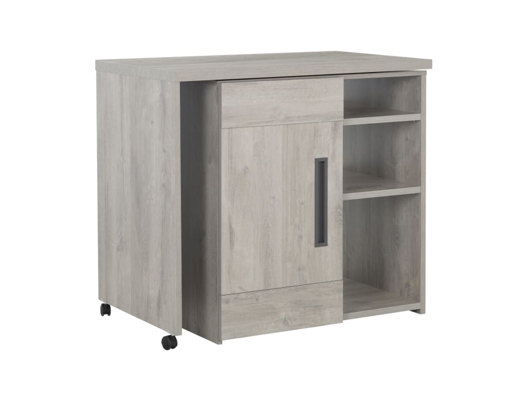 Bar pivotant effet bois chêne gris clair avec roulettes et étagères