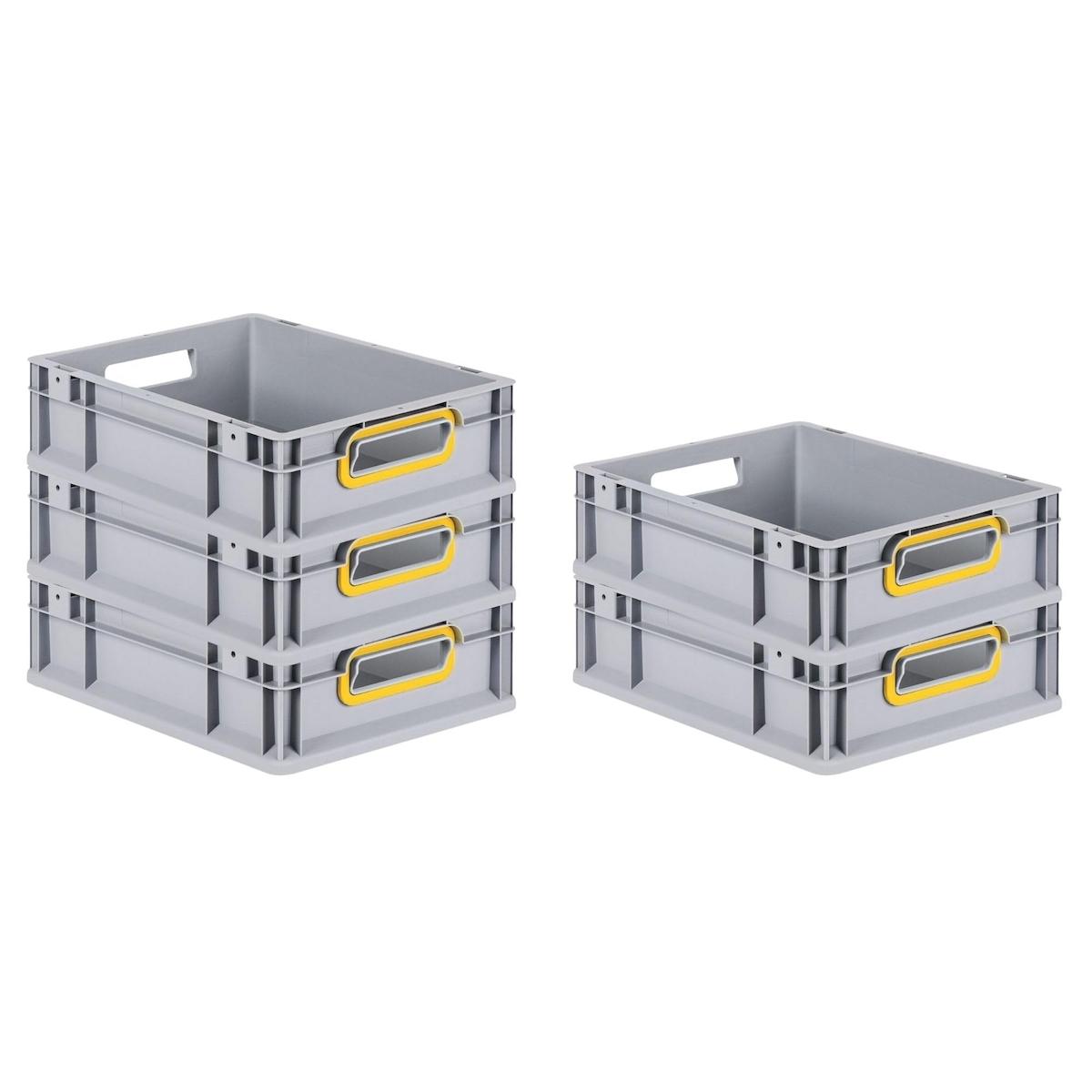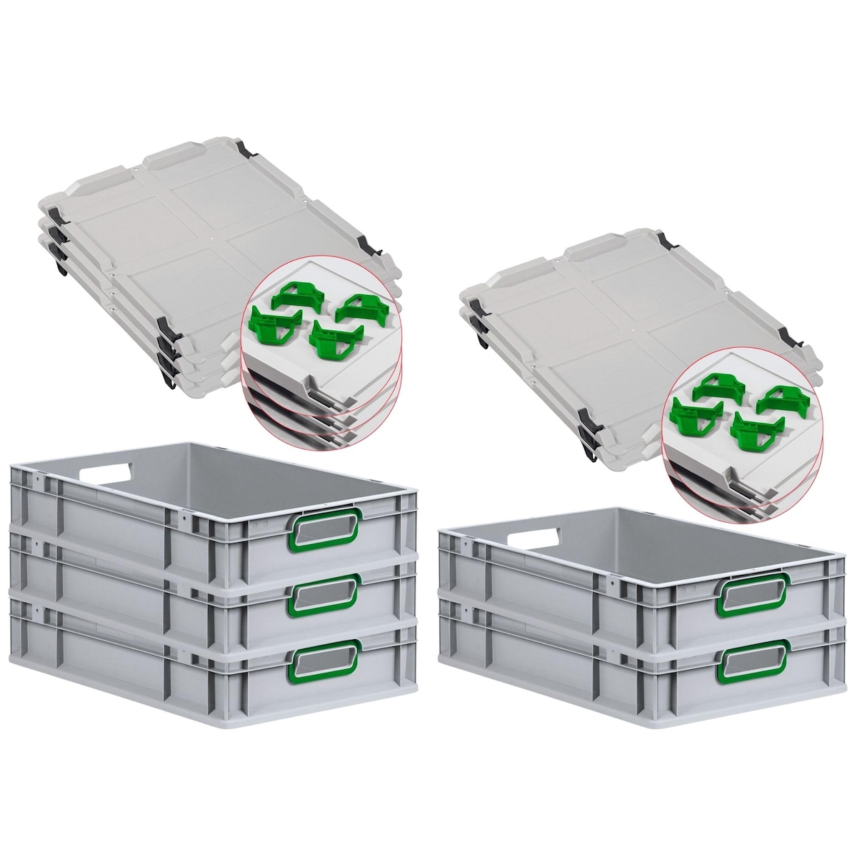PROREGAL SparSet 5x Eurobox NextGen Color mit Auflagedeckel & Verschlüsse, HxBxT 12x40x60cm, 23L, Grau, Griffe grün offen, Eurobehälter, Box