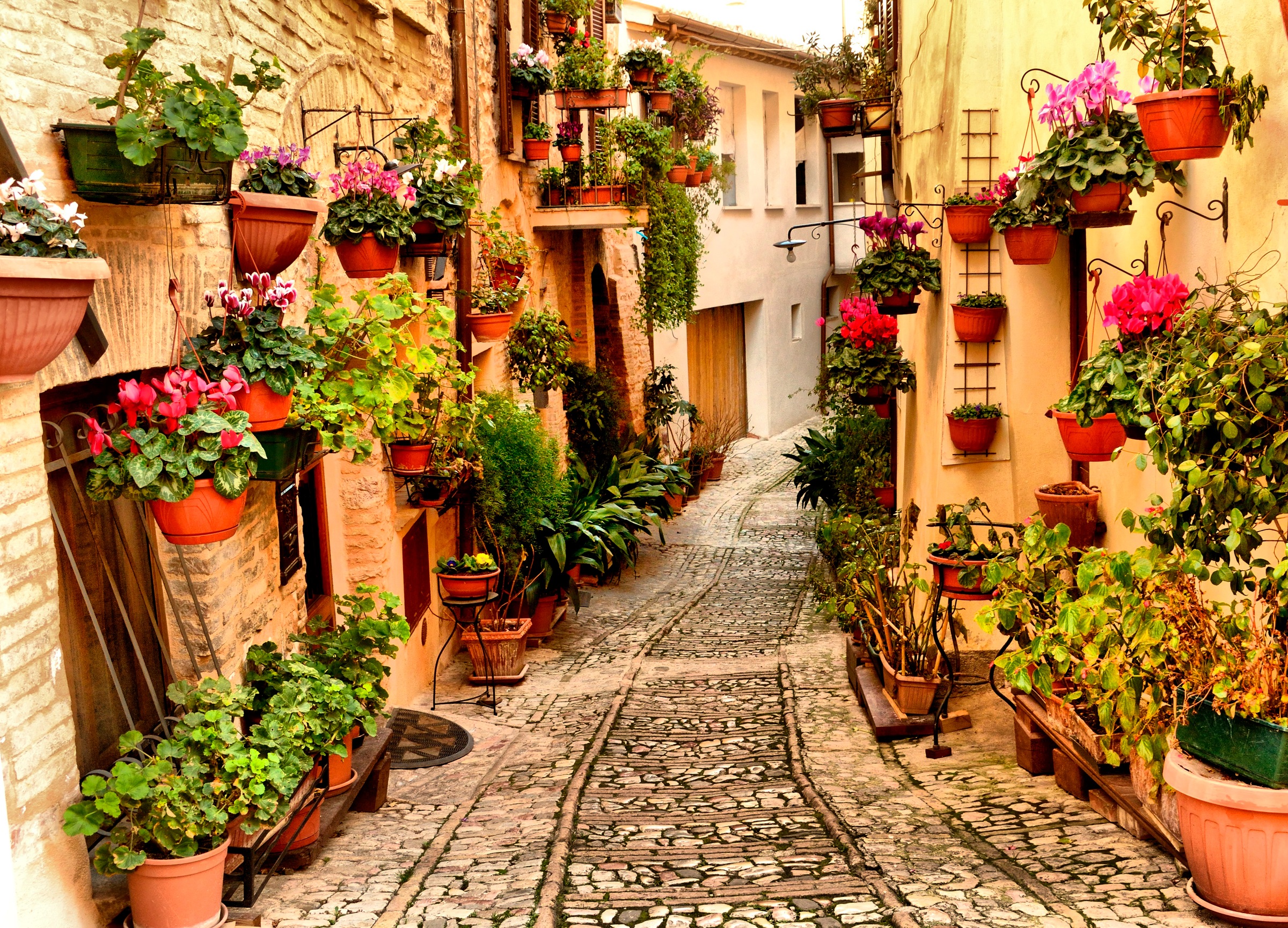Fototapete PAPERMOON "Alley in Spello Umbria", bunt (mehrfarbig), B:5m L:2,8m, Vlies, Tapeten