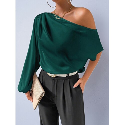 Per donna Camicia Camicia in raso Blusa Top con spalle scoperte Arricciato Tinta unica Semplice Elegante Essenziale Classico Manica Lunga Senza Spalle Top Regolari Quotidiano Ferie Uscire Blu Nero