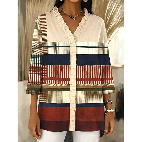 Per donna Camicia Camicia Boho Arricciato Volant Ombre Grafico Geometrico Elegante Vintage Quotidiano Manica Lunga Scollo a V Top lunghi Quotidiano Lavoro Ferie Rosa Verde Cachi Estate Primavera