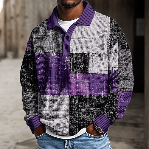 Per uomo Patchwork Polo Testurizzato Manica Lunga Magliette polo Bavero Casual Scuola Athleisure Abbigliamento quotidiano Stampa 3D Primavera Autunno Inverno Rosso Viola Verde