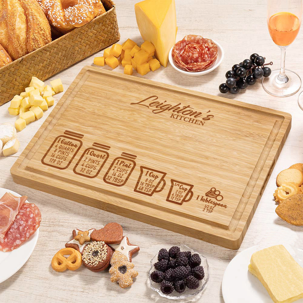 Tabella di conversione da cucina incisa personalizzata Tagliere per salumi in bambù FSC con scanalatura per il succo Regalo di compleanno per la famiglia, gli amici e i parenti