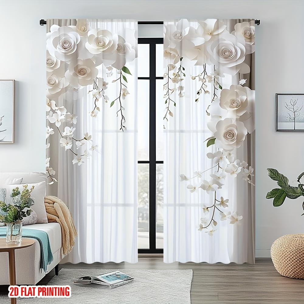 2 szt. Eleganckie Białe Kwiatowe Przezroczyste Zasłony, Płaski Wzór 2D Poliester Tunel na Drążek do Salonu Sypialni Biura Domku Wakacyjnego Dekoracja