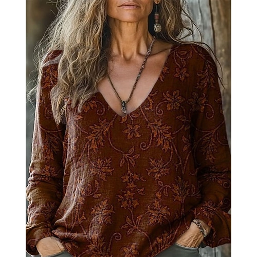 Per donna Blusa Floreale Grafico Elegante Vintage Manica Lunga Scollo a V Top Regolari Quotidiano Ferie Uscire Arricciato Vino Verde militare Rosso Blu Viola chiaro Primavera Autunno