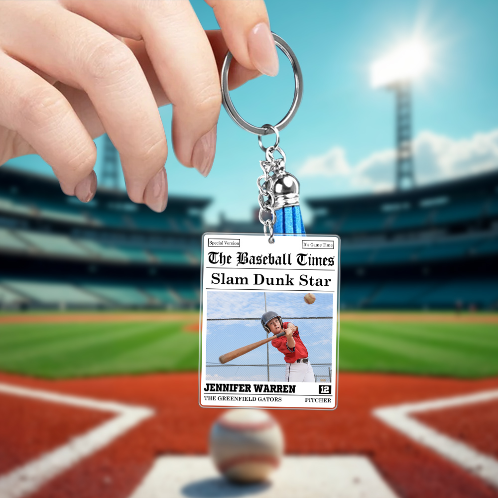 Portachiavi personalizzato in acrilico con foto di giornale sportivo, nome della squadra, numero e nappina Regalo di compleanno per giocatori amanti dello sport