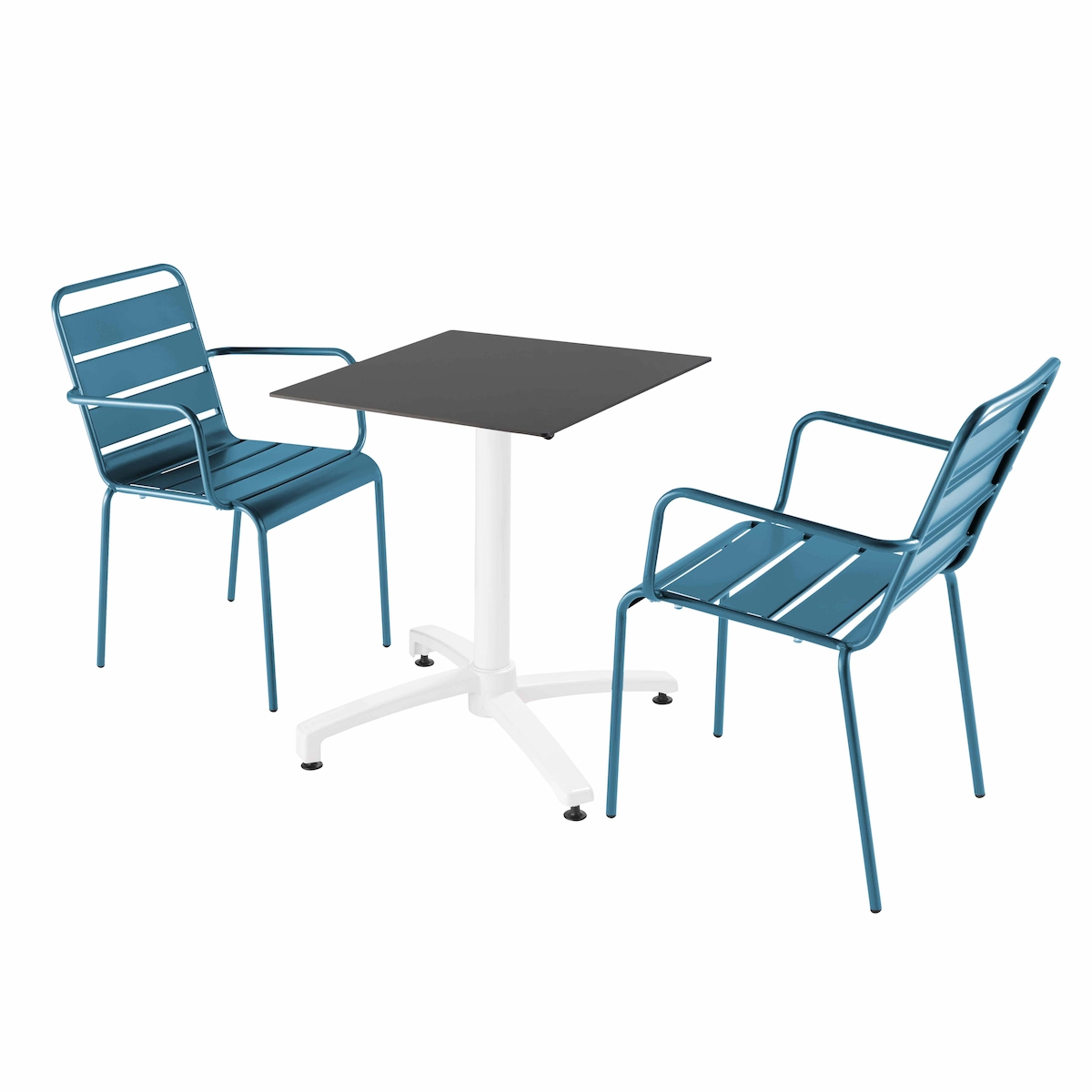 Oviala Business Set aus schwarzem Laminat-Terrassentisch und 2 pacific-blauen Sesseln
