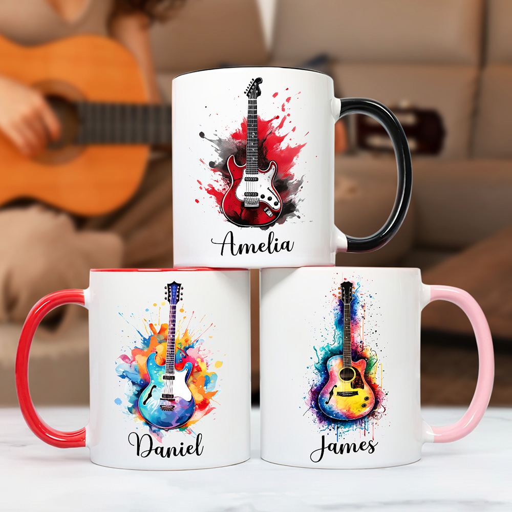 Taza de cerámica personalizada de 11oz con nombre y asa para los amantes de la guitarra
