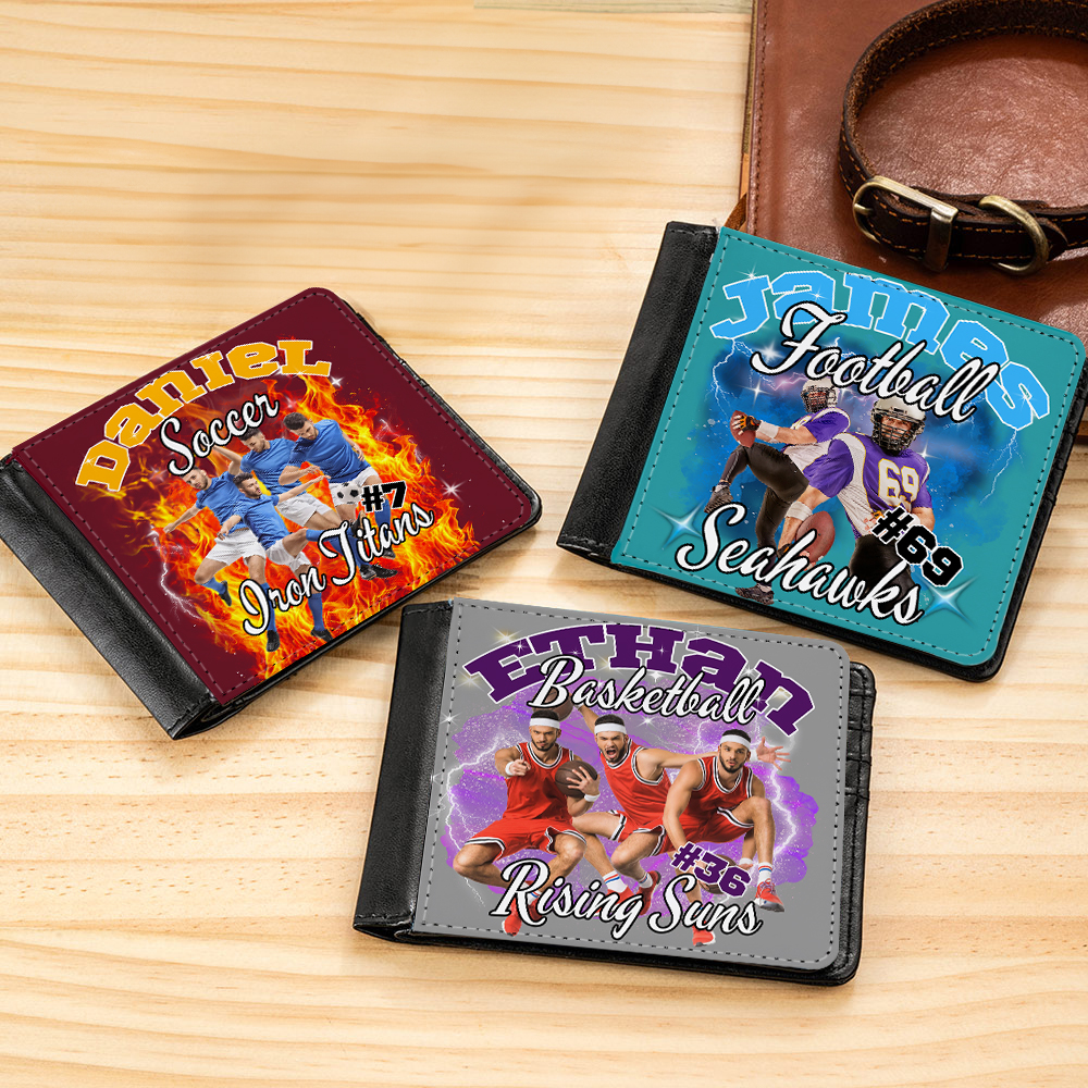 Personalizada de color Llama Rayo 1-5 Foto Collage Billetera de hombre de cuero con nombre y número de cumpleaños Accesorios de viaje Regalo para los amantes del deporte