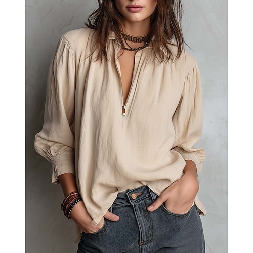 Per donna Camicie di cotone e lino Tinta unica Quotidiano Essenziale Casual Manica Lunga Scollo a V Top Regolari Quotidiano Arricciato Blu Bianco Rosa Verde Estate Primavera Autunno