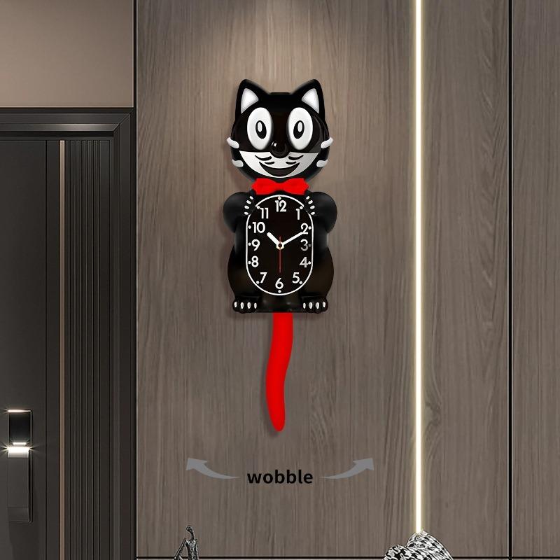 Søt Katteveggdekor Svarte Enkle Klokker Glass Speilflate 2D Stille Klokke Tegneseriekatt Veggklokke Hale Svinger