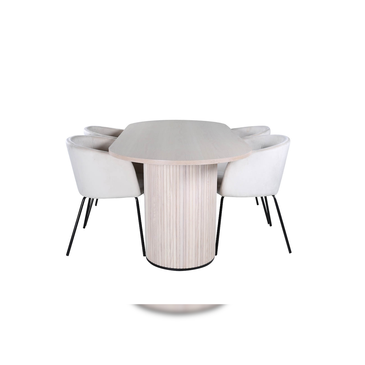 BiancaWW Essgruppe Esstisch Eiche Furnier weiß washed und 4 Berit Esszimmerstühle Velour beige.