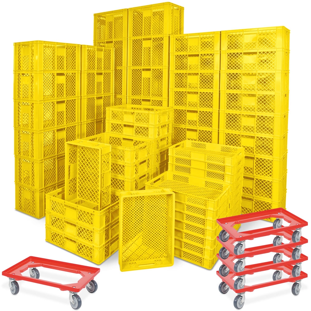 BRB 78 Stück Stapelkörbe/Bäckerkästen in 5 Größen, Grundmaß LxB 600 x 400 mm, H 90 mm, 150 mm, 240 mm, 320 mm, 410 mm, Farbe gelb, rot
