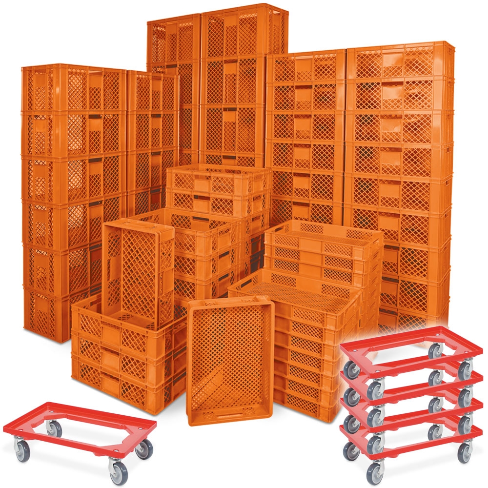 BRB 78 Stück Stapelkörbe/Bäckerkästen in 5 Größen, Grundmaß LxB 600 x 400 mm, H 90 mm, 150 mm, 240 mm, 320 mm, 410 mm, Farbe orange, rot